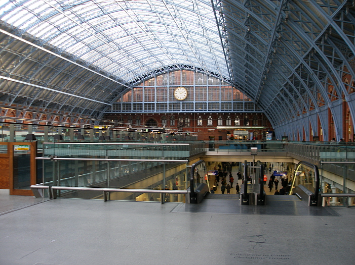 A southward view provides a glimpse of the undercroft area, which has become a shopping arcade, in addition to providing access to the international platforms, via travelators. On the left can be seen Europe's longest champagne bar, measuring over 90 metres in length. Restoration work of the former Midland Hotel, behind the trainshed, was still ongoing. Proposals included converting part of the building into a five-star hotel, whilst giving the rest over to apartments, and completion is expected for 2009. © David Glasspool