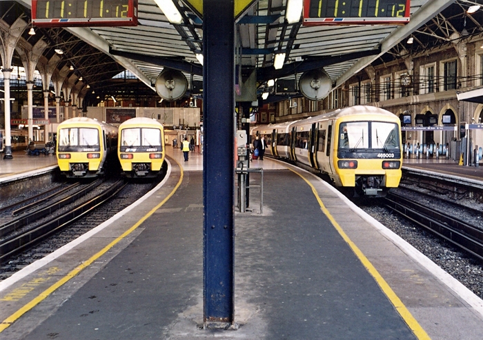 A trio of suburban services are seen stabled in the platforms. From left to right: Class 465 unit Nos. 465002,