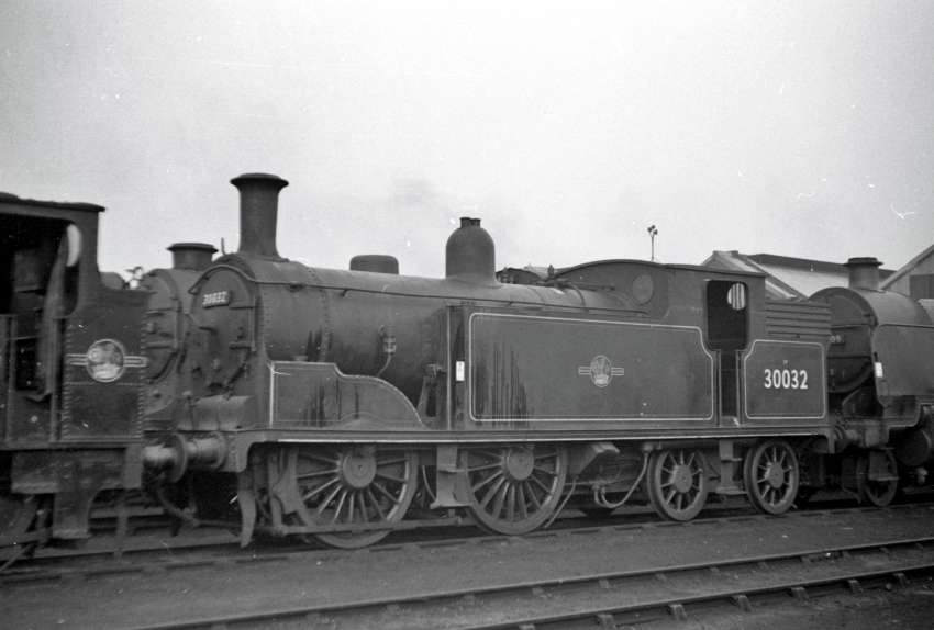 A little grubby, but still in fine fettle, No. 30032 is depicted on the shed lines at Eastleigh. As of 30th January 1963, the Ian Allan ABC locoshed book has No. 30032 as being allocated to Feltham (70B); by the subsequent edition current to 11th November of that year, the engine had disappeared from lists. © David Glasspool Collection