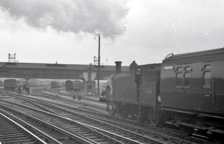 No. 30248 is seen shunting empty carriages (the vehicle in view being a Bulleid design) in the unmistakeable environs of Clapham Junction. It was at this time that ex-GWR "5700" Pannier Tanks started arriving in force at Nine Elms to replace the "M7" Tanks on empty stock workings to and from Waterloo. © David Glasspool Collection