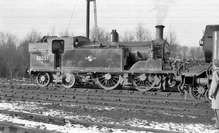 In fine external condition, No. 30051 is seen at Redhill Shed. At this time, the locomotive was allocated to Horsham, both the shed there and that at Redhill coming under Brighton's "75" series. This was one of thirty-six of the "M7" Class to be equipped with a compressed air system for push-pull working. © David Glasspool Collection