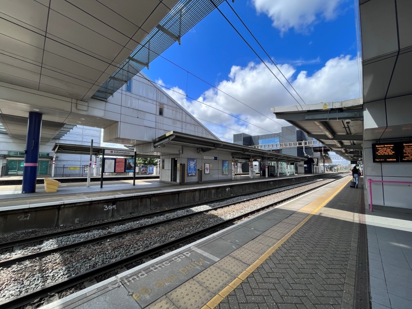 Situated upon the Midland Main Line in Bedfordshire, 29-miles from St Pancras and under a mile south east of those platforms which serve Luton town, this station — as the name suggests — primarily serves London’s fifth airport. Four platform faces, each about 250-metres (820-feet) in length, serve an equal number of tracks, and are situated one mile west of the airport’s sole terminal. An enclosed glazed footbridge, positioned at the southeastern end of the station and linking all four platforms with a main building on the “up” side of the running lines, dates from opening.