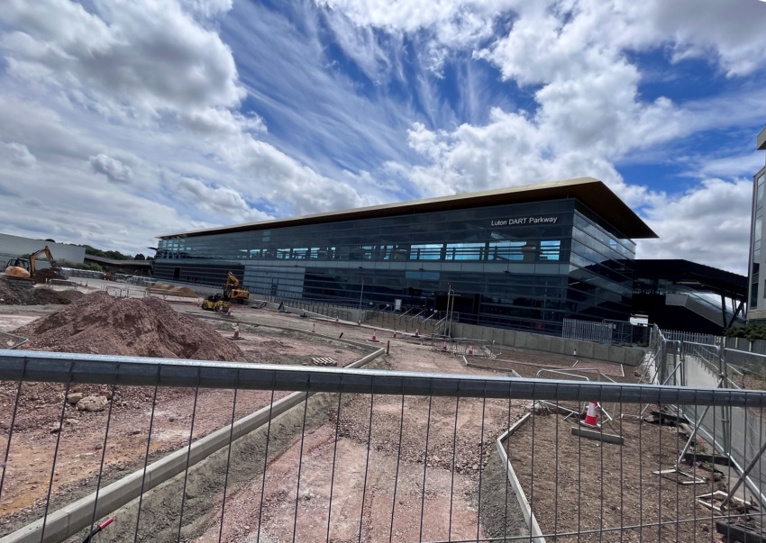 This view depicts the terminus of the "DART" system at Luton Airport, just a 135-metre walk from the terminal. The platforms are at a lower level, to the right. © David Glasspool