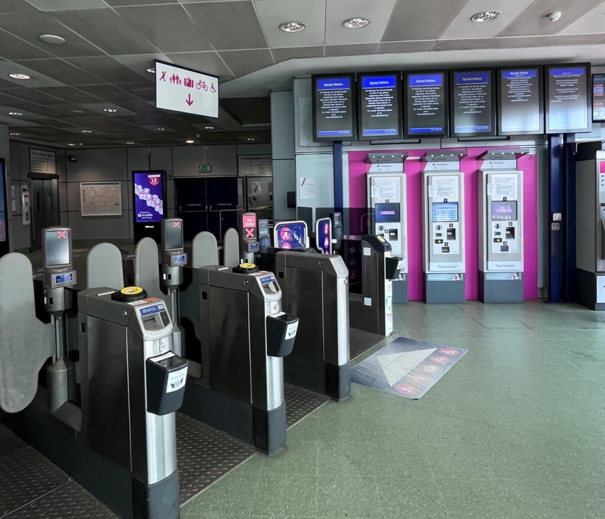 The ticket hall seen here is situated on the western side of the tracks, within the main station building. The latter is a two-storey-high structure with a triangular floor plan and is clad with grey tiles. © David Glasspool