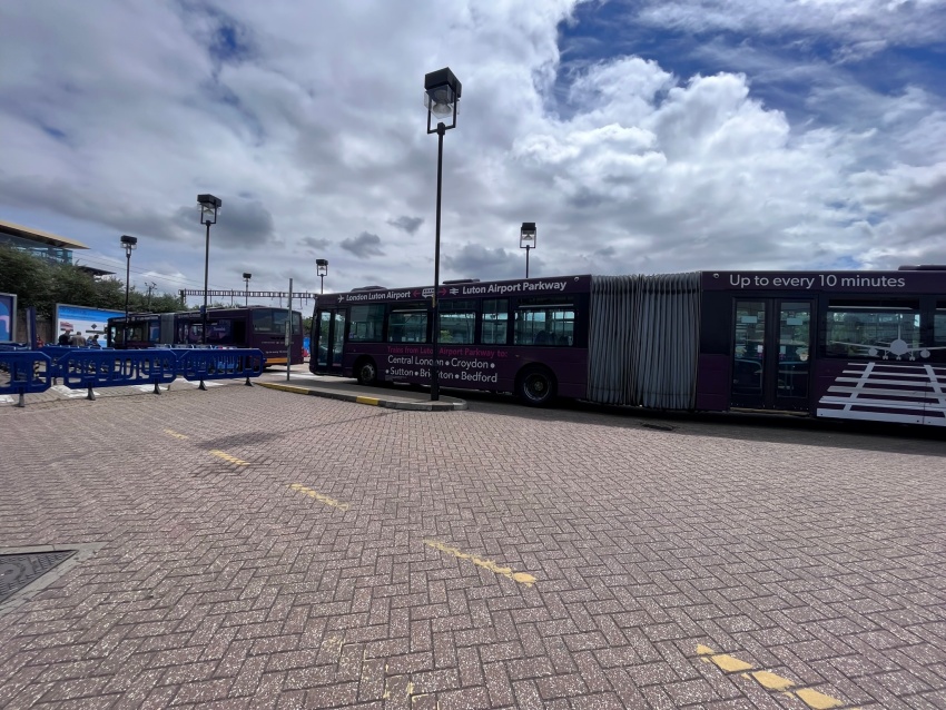 At the time of this photograph, the link between the railway station and airport was maintained by the “bendy bus” service seen here, operated under the “Thameslink” brand. The bus stop is on the station’s forecourt on the western (“down”) side of the tracks. © David Glasspool