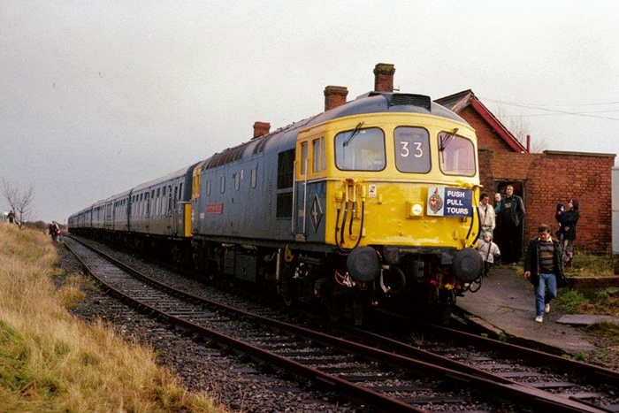 Class 33 No. 33116 formed a rail tour down the Dungeness branch in 1993, pairing with 4TC unit Nos. 410 and 417. The return leg to Ashford is seen above, at a time when the run-a-round loop was still in evidence. © Wayne Walsh