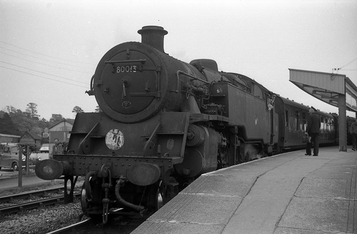 The end of steam on the line is imminent as BR Standard Tank No. 80013, shorn of a smoke box number plate, awaits departure with the return trip to Brockenhurst. The run-a-round-loop can be seen on the left. The main station name board can be seen on the extreme right, facing away from the engine, sandwiched in-between the first two canopy struts. © David Glasspool Collection