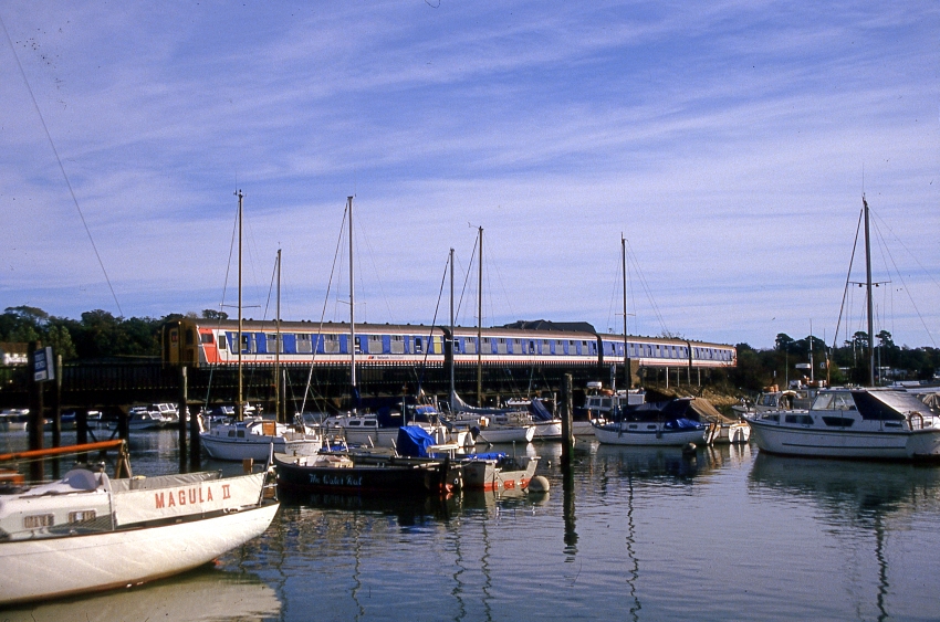 4 CIG No. 1225, looking resplendent in Network SouthEast livery, is seen crossing the bridge which carries the railway over Lymington River, Pier-bound. © David Glasspool Collection
