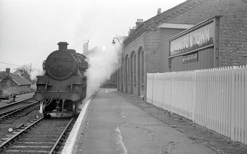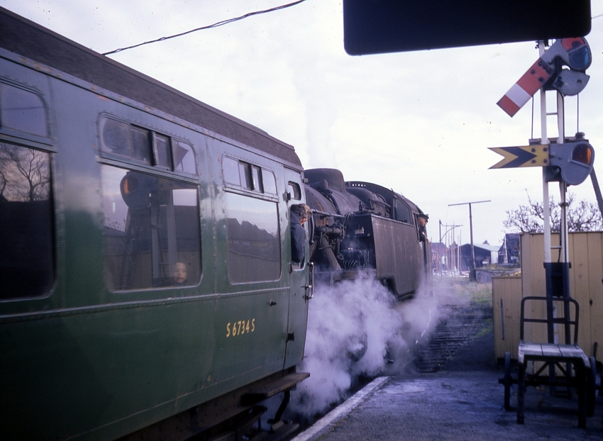Standard Tank No. 80085 is seen departing Lymington Town on the final leg of its journey to the Pier station, with Bulleid coaching stock in tow. Note the curiously short "home" and "distant" semaphore signal arms. To the right of the locomotive can be seen the sleepers of a then recently lifted siding, which formerly served a cattle dock and led to the original jetty used by the LSWR to meet Isle of Wight ferries, before the extension to the Pier station was commissioned. © David Glasspool Collection