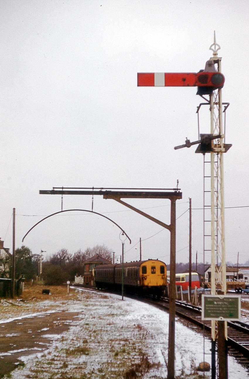A 2-HAP is seen entering from the Brockenhurst direction, having just passed over Bridge Road level crossing. The latter still had traditional gates and, beside it, can be seen the SR-designed signal box of 1928. The vacant land in the foreground was once the station's goods yard and the loading gauge formerly stood over the siding which fed the goods shed. The engine shed was swiftly demolished after the end of steam traction on the South Western Division, having once stood on that site now fenced off, to the right of the 2-HAP. The signal post in the foreground still displayed a "Southern Railway" warning sign. © David Glasspool Collection