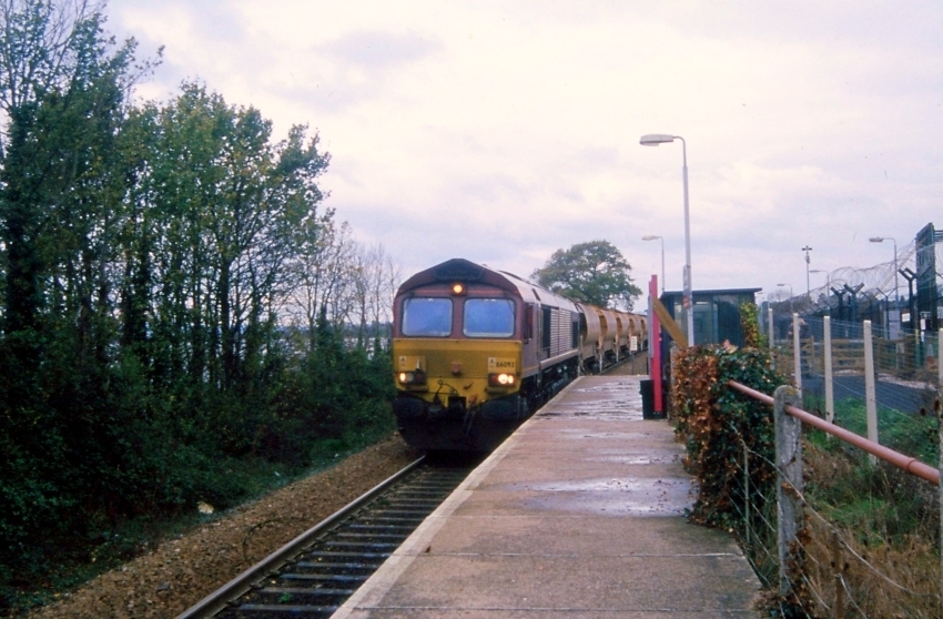 Engineering works are evident in this northward view, which shows Class 66 No. 66093 at one end of a top-and-tailed ballast train, entering the platform of Lympstone Commando. The barbed wire in the right background is that of the Commando Training Centre, whilst behind the trees on the left is the Exe estuary. © David Glasspool Collection