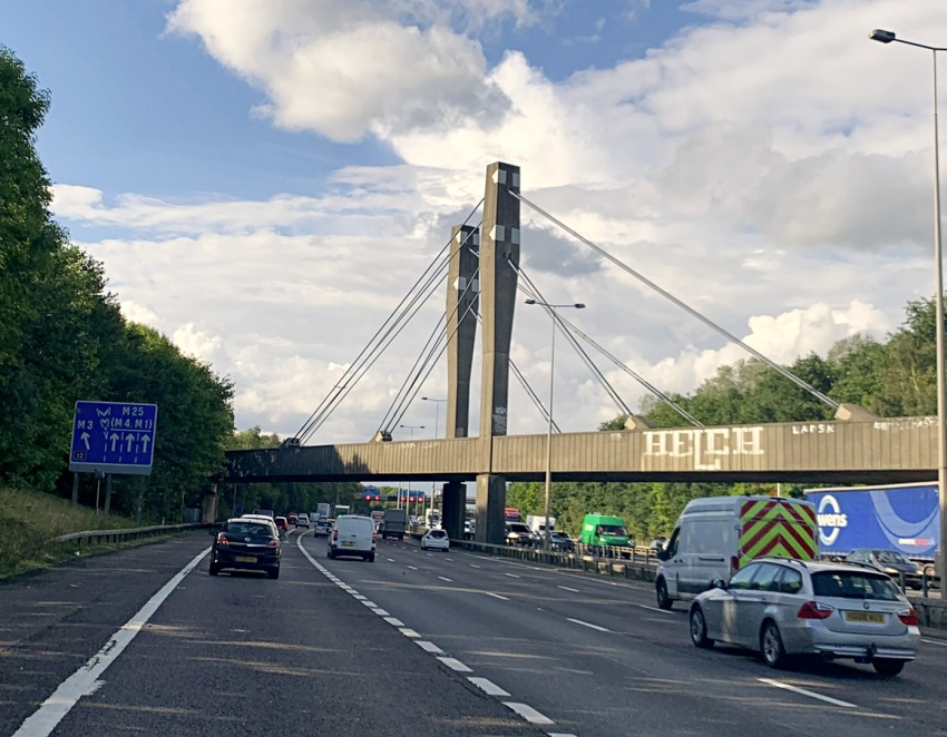 A northward view on the approach to Junction 12 of the M25, travelling clockwise, shows to good effect the angled nature of the bridge over the motorway. Virginia Water is to the left; Chertsey, Addlestone, and the Waterloo Main Line are to the right. © Magdalena Pacyk