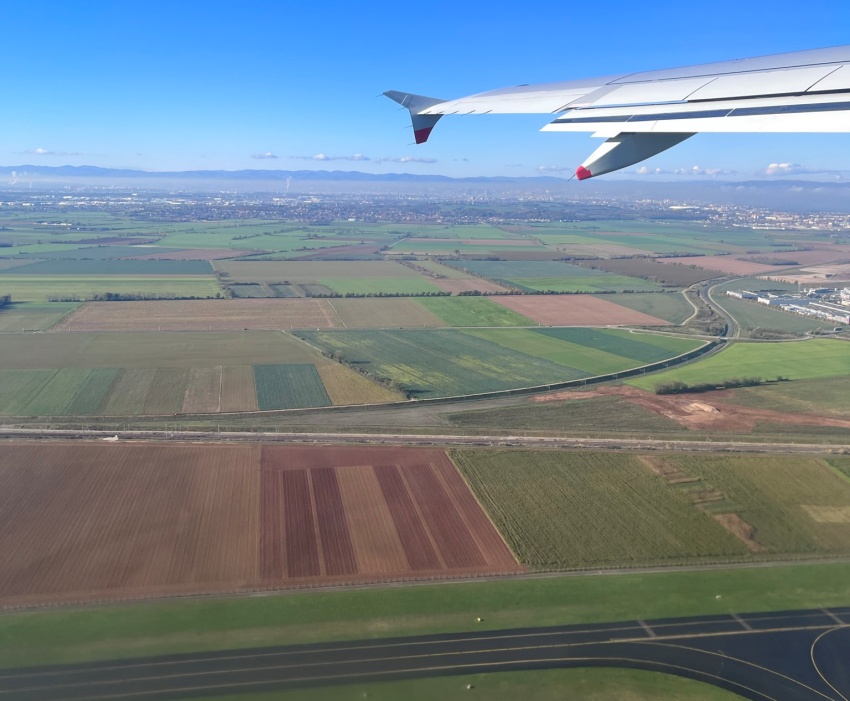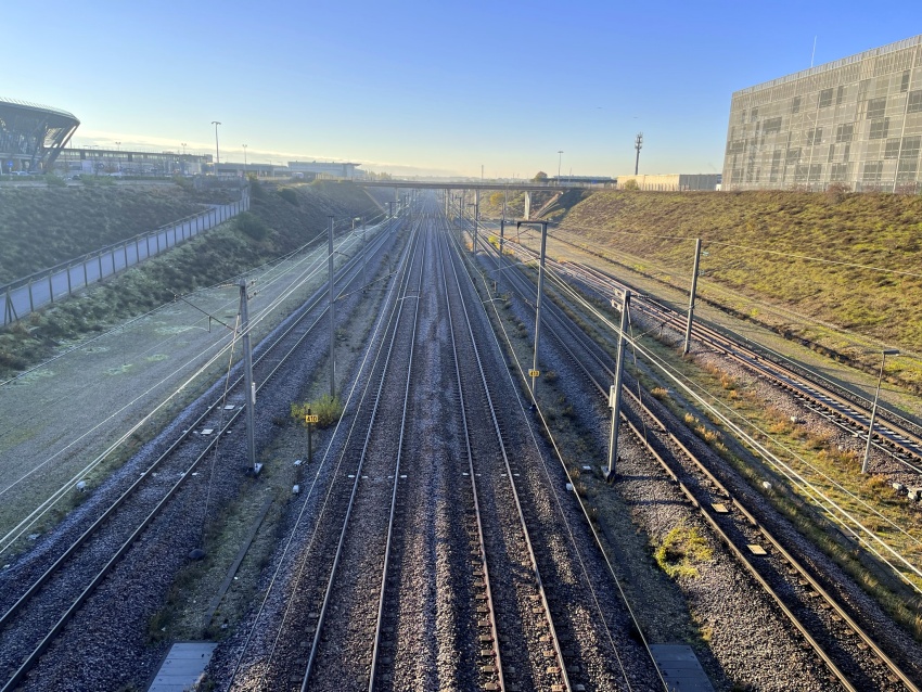 A westward view has the LGV running straight from left to right, between Saint Exupéry and Montanay Junction, and the Rhônexpress tramway curving away towards the city. © David Glasspool
