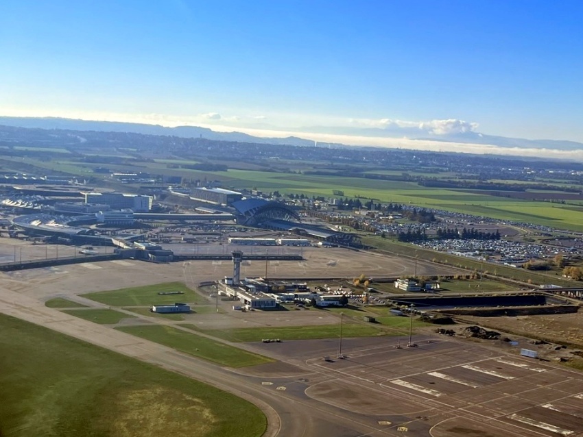 Takeoff! This view shows to good effect the railway station’s positioning in relation to the terminal buildings. The station’s main hall is by far the most prominent feature amongst the collection of airport buildings. © David Glasspool