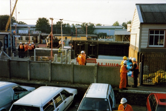 One of the fifteen air-braked ferry wagons is seen on its side in this view from behind the ''up'' platform. The Civil