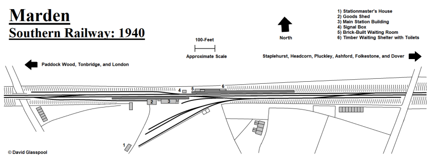 Platforms have existed at Marden ever since the South Eastern Railway’s (SER) earliest days of running passenger services through the Kentish Weald. Some red brick of the platform faces may still exist from those formative days, but today’s station building is very much a modern affair, procured at a time when many railway structures upon the former South Eastern Division, dating from the 19th Century, were replaced by up-to-date facilities.