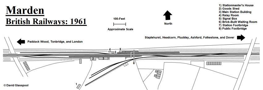 Phase 2 of the Kent Coast Electrification Scheme under British Railways brought a series of changes to Marden. In 1960, the "up" platform was lengthened at its eastern end using prefabricated concrete components. The "down" platform was not so treated — extension of this surface in the western direction was precluded by the presence of the signal box and it was decided not to lengthen eastwards. A prefabricated concrete footbridge linking both platforms was installed about 100-feet east of the existing track foot crossing, the latter of which it ultimately replaced. At the same time, a metal bridge was installed across the running lines, immediately adjacent to the station’s footbridge, to carry a public footpath. Based on photographs of the era, the installation of the bridges appears to have coincided with the flattening of the timber waiting shelter upon the "down" platform.