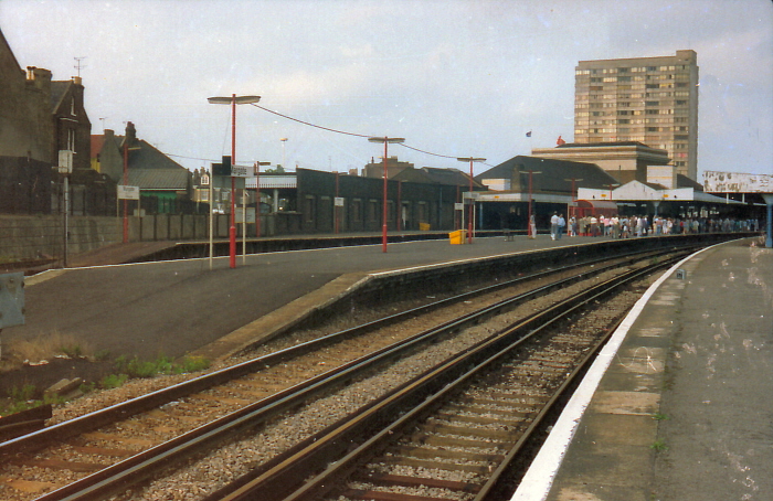 A north easterly view reveals the intricate canopy valance of the parcels dock platform, which survived being simplified or wholly abolished during 1970s rationalisation. Upon the island platform can be seen one of the glazed bus shelters of Network SouthEast, installed in the previous year. The reason for the crowd of people on the platform becomes clear in the next view. © John Horton