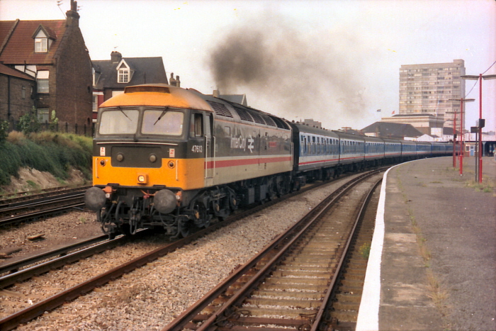 Class 47 No. 47613 ''North Star'' is seen roaring out of Margate with a mixture of BR Mk 1 and BR Mk 2a Network SouthEast coaching stock. The train is the return leg of an excursion from Oxford to Canterbury West. © John Horton