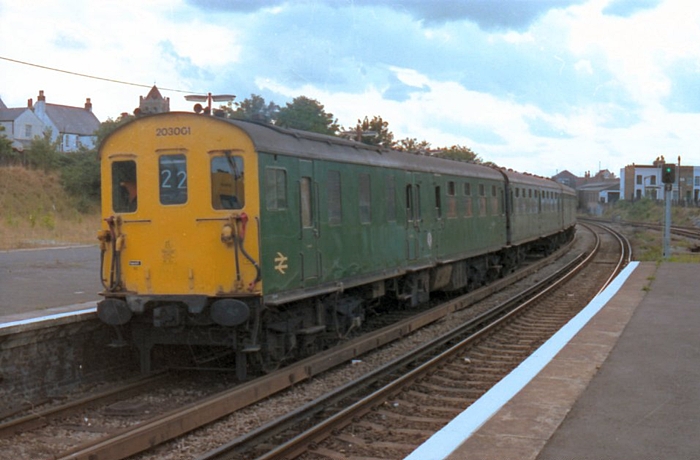 Hastings unit No. 203001 was painted in this peculiar all-over green livery, wearing both BR roundels and the