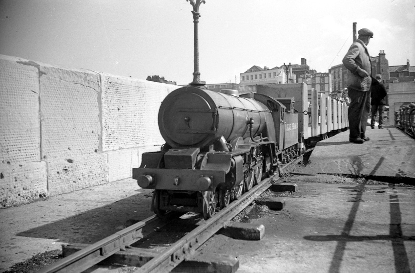 The newspaper article indicates that the gauge was 10½-inch, although other sources suggest it was 10¼-inch. The extent of the single-track line was approximately 230-yards which, as remarked above, ran upon the Upper Promenade of the pier. At the landward end of the railway, two platforms were in evidence, flanking either side of the single track; at the seaward end, just short of the lighthouse, the line terminated within a curved metal shed. Motive power was in the form of a miniature 4-6-2 "A3" Pacific locomotive.