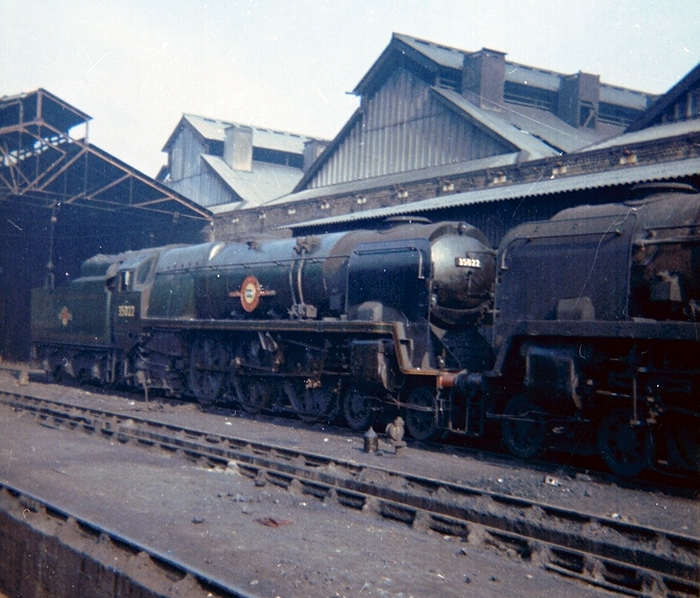 A view from 1964 shows No. 35022 parked outside Nine Elms ''old shed'', in a very clean external condition for the time. The engine's final shed allocation was in fact Weymouth, it being withdrawn from there in May 1966. It was sold to Woodham Brothers, Barry, and finally rescued from there for preservation. Since then, it has remained unrestored, and is apparently being used as a spares donor for No. 35027 ''Port Line''. No. 35022 was one of the earliest members of the class to be rebuilt, in June 1956. It was less than ten years old at that time, having been commissioned to traffic in October 1948. © David Glasspool Collection