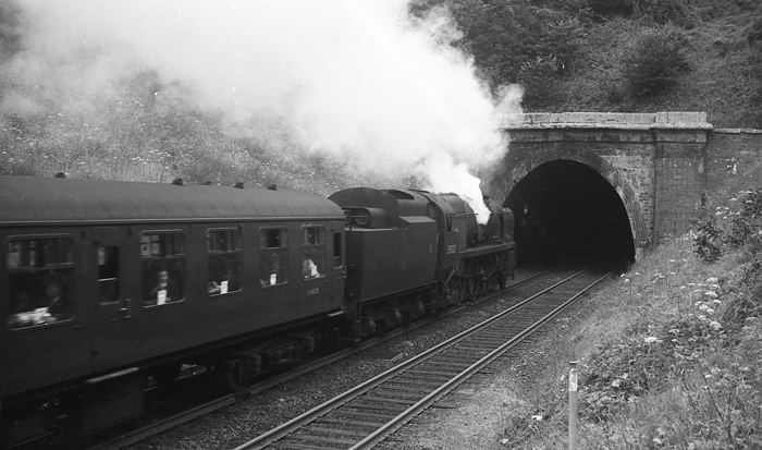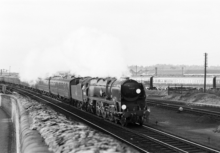 As of 1959, three MN engines were allocated to the South Eastern Division, all based at Stewarts Lane: the doyen of the class, No. 35001 ‘’Channel Packet’’; No. 35015 ‘’Rotterdam Lloyd’’; and No. 35028 ‘’Clan Line’’. In addition, ten were based at Nine Elms, seven at Bournemouth, seven at Exmouth Junction, and finally, three at Salisbury. The start of full-accelerated electric timetables on Kent Coast Lines (first the main ‘’Chatham’’ line on 15th June 1959, followed by the ex-SER trunk route via Tonbridge and Ashford on 18th June 1962), meant that steam became virtually extinct on the South Eastern Division. The remaining Bulleid Pacifics were transferred to the South Western Division, where steam traction had yet to be fully ousted. A large blow to the SR Pacific fleet came on 15th September 1962, when all Southern Region lines west of Salisbury were brought under the control of Paddington. Thus, all those engines based at Exmouth Junction, including the seven MNs, were absorbed into the Western Region fleet. Of those MN locomotives, just one, No. 35009 ‘’Shaw Savill’’, was withdrawn by the WR during the elimination of steam traction in the Exeter area, in September 1964. Happily, the other six members made their way back to the Southern Region, all but one (No. 35011 ‘’General Steam Navigation’’) remaining in service until summer 1967.