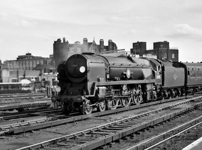 The rebuild involved eliminating the chain-driven valve gear and oil bath, and incorporating the more common Walschaerts’ system. The steam reverser was removed in favour of a screw reverser, and the inside cylinder replaced by a completely new design. In brief, the steam reverser was linked to the valve gear and controlled the admission of steam to the cylinders through regulating the timing of the valves. Whether the locomotive moved backwards or forwards was determined by steam being sent into the cylinders above or below the pistons. Visually, the greatest alteration was the removal of the ‘’air-smoothed’’ casing and fitting of conventional boiler cladding. Again, emphasis was made on bringing these engines in line with the BR Standards then being brought into service. Removal of the casing provided improved access to boiler fittings, and room was now available for step-boards above the wheels. BR-style smoke deflectors were also fitted. No. 35018 ‘’British India Line’’ was the first engine selected for rebuilding, and was admitted to Eastleigh works on 16th November 1955. The work was completed over a three-month period, and No. 35018 was outshopped in its new form and put on display at Waterloo’s platform 15, on 14th February 1956. No. 35028 was the final of the MN Class to be rebuilt, entering Eastleigh Works in October 1959.