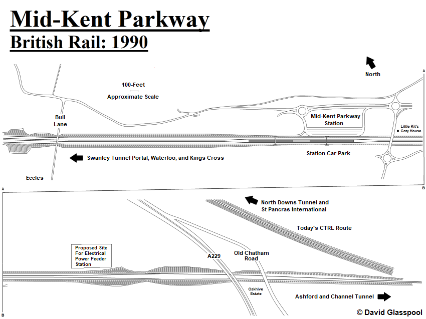 In 1990, BR business sector "Network SouthEast" (NSE) started to promote a Mid-Kent Parkway station as part of BR’s CTRL. Whilst it was suggested that BR was still consulting various stakeholders on the best site for the station, in reality the location had by that time been narrowed down to an area within the Parish of Aylesford, west of the A229. The line bordered the northern perimeters of Eccles and Sandling villages, and situated in-between the two was to be the Parkway station. A single island platform, 400-metres in length, was envisaged; the double CTRL line would widen to four tracks at this point; two serving the station and the remaining pair bypassing the platform to accommodate non-stop trains. NSE’s promotional material of the time stated that car parks with 4,000 space capacity would be linked to the island platform by footbridges. An artist’s impression of the station showed a flat-roofed rectangular platform canopy which looked like it had come straight out of the architectural playbook for the 1960s West Coast Main Line electrification, closely resembling those examples built at Wolverhampton and Coventry.
