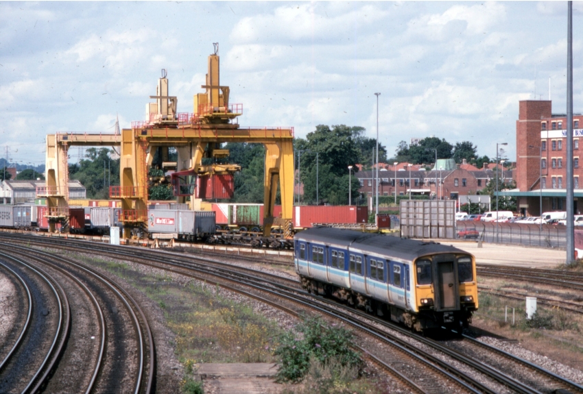 A westward view from the footbridge at Millbrook station shows both “Goliath” cranes, one of which is in the process of moving a container. Class 150 “Sprinter” No. 150219 is seen passing with what is likely to be a service to Southampton Central from Bristol Temple Meads. © David Glasspool Collection