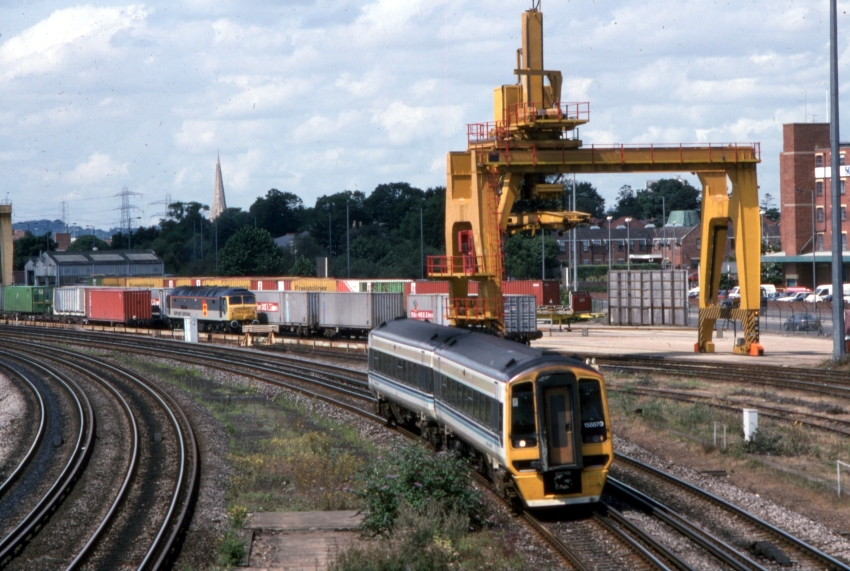 In the background, resplendent in the two-tone grey livery of Railfreight Distribution, is Class 47 No. 47095. This locomotive had been named “Southampton WRD Quality Approved” at Millbrook on 19th April 1994, in recognition of the wagon repair depot at nearby Southampton Maritime Freightliner Terminal gaining a formal British Standard accreditation of quality assurance. Class 158870 is likely on a Cardiff Central to Portsmouth Harbour service. © David Glasspool Collection