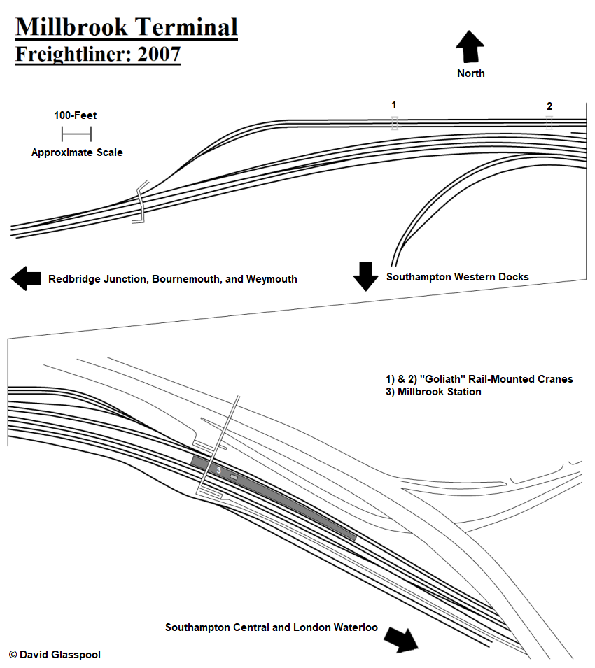 In 1967, the Minister of Transport approved the construction of a Freightliner terminal in the Southampton suburb of Millbrook, at a cost of £250,000 (ref: The Railway Magazine, August 1967). The site selected was that of Millbrook station’s goods yard, which was positioned on the northern side of the main line running between Southampton and Bournemouth. Closure of this yard to public goods traffic was effective on and from 17th July 1967 (ref: Clinker’s Register, 1980), and the terminal was scheduled to open in December of that year and occupy a ten-acre site.
