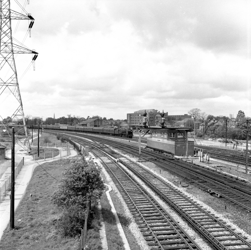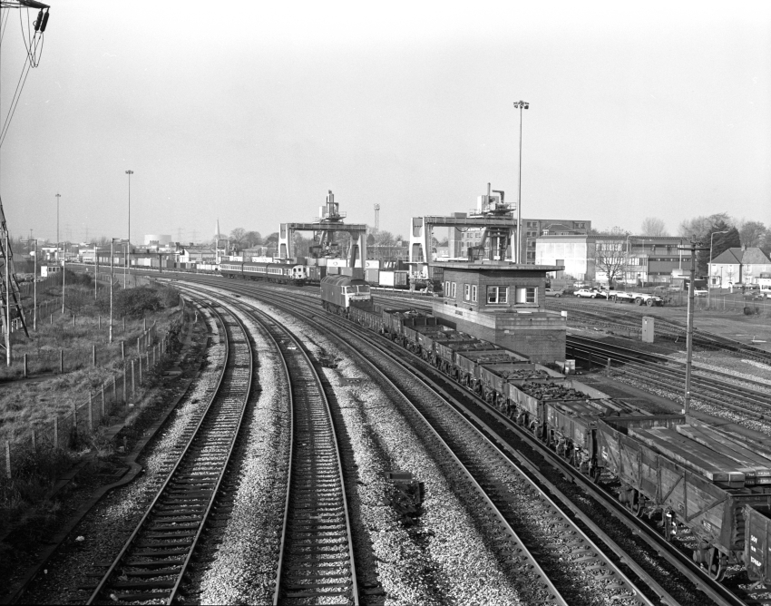 The same viewpoint as the May 1967 photograph, but thirteen years on. The signal box, although still standing, had become defunct the previous year and colour lights had replaced semaphores. A Freightliner container terminal had been operational on the former goods yard site since January 1968. Class 47 No. 47362 is seen hauling a train of permanent way materials, whilst in the background, a Hampshire/Berkshire DEMU approaches. © David Glasspool Collection