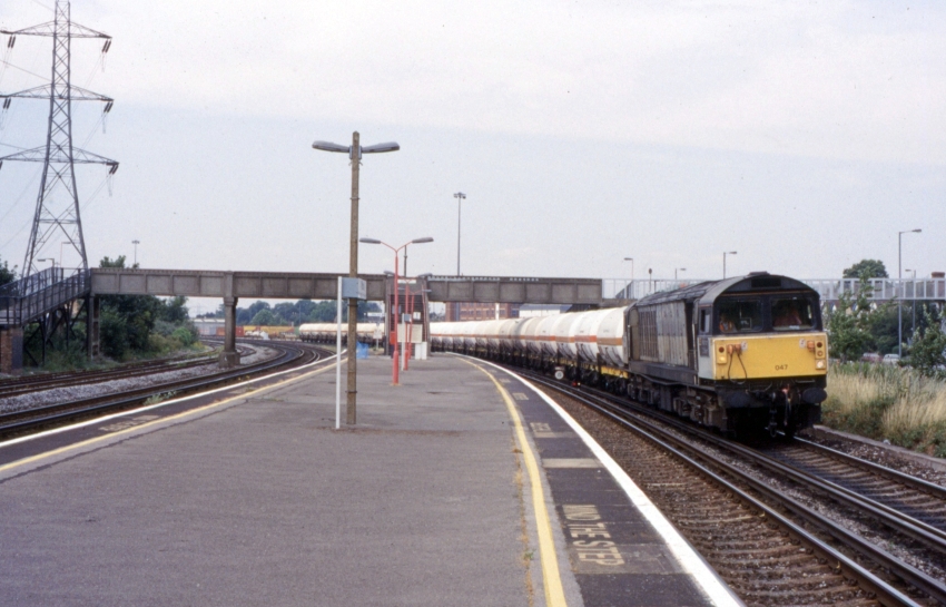 A desolate westward scene shows the island platform shorn of its offices and canopy — passengers had no protection from the elements by this stage. The SR’s footbridge remained, as did concrete lampposts of the same vintage, but the rest had gone. Class 58 No. 58047 is seen with what your author believes to be LPG tanks from Fawley, bound for Eastleigh. © David Glasspool Collection