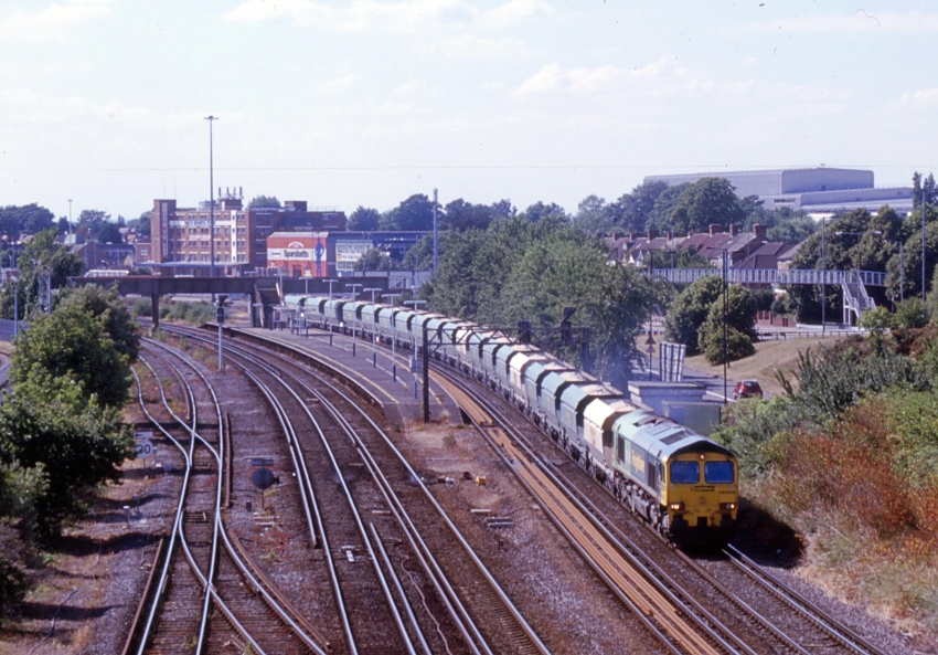 By the time of this westward view, a token section of canopy had been installed upon the island, to at least provide some shelter. The footbridge’s extension over Millbrook Road (A33) can be seen in the right background. No. 66522 is seen hauling what your author believes to be loaded sand hoppers from Wool (Dorset) to Angerstein Wharf, London Borough of Greenwich. © David Glasspool Collection