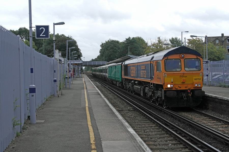 Cruising through platform 1 is GBRf Class 66 No. 66752 hauling the 5X89 11:29 working from Slade Green Depot to Doncaster Works Wagon Shops. In the consist is a Class 465 unit sandwiched in-between two barrier vehicles converted from former Class 508 EMU trailers. A programme is currently underway to equip the Class 465 fleet with lavatories which meet Railway Vehicle Access Regulations (RVAR). As per those on Class 375 and 395 fleets, this will make the toilets wheelchair accessible, and the work is being carried out by Wabtec Rail Limited at Doncaster. © David Glasspool