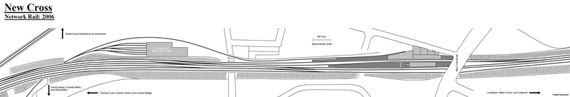 Track layout of the rebuilt station in 2006, showing new platform arrangement. Drawn by David Glasspool