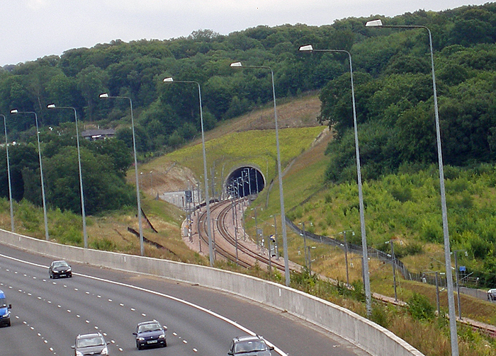 The double-track CTRL line is seen plunging into the northern portal of the two-mile long North Downs Tunnel on 7th August 2007. In the foreground is the London-bound carriageway of the M2, which was upgraded to four lanes each way at the time of the adjacent railway works. © David Glasspool