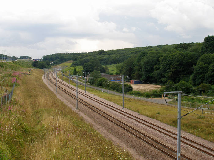 A view towards the tunnel portal on 7th August 2007 reveals the Nashenden site once outlined as the location for an international station. On the left of the line is the M2, whilst to the right of the tracks is Nashenden Farm. © David Glasspool