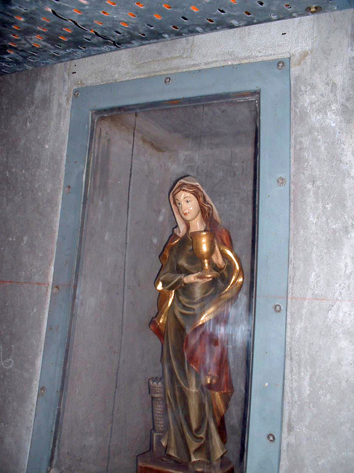 Here is a feature which even a regular user of the line would not know exists. Approximately 10-metres inside the tunnel from the London-end portal sits a statue of "St. Barbara", patron saint of tunnellers and miners. At window level you can see where the cable troughs are routed around the cutout in the wall on the "down" side. © Paul Cooper-Hayden