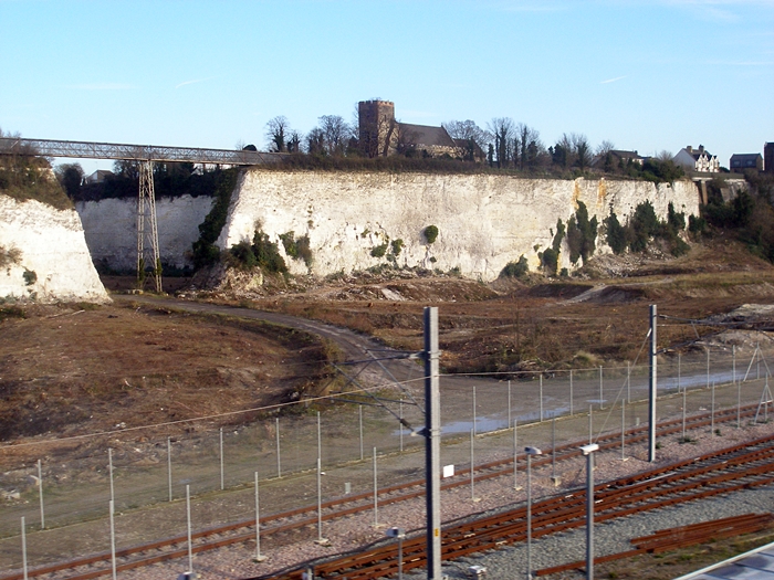 A view from the North Kent Line towards Church Path Pit shows, in the immediate foreground, the CTRL sidings fanning out. The single-track enclosed on both sides by fencing is that leading to the former site of the cement works. By this time, the eastern tunnel had been unblocked and track continued through to the riverside. The cleared track bed on the left, curving under the footbridge, leads to the western tunnel. © David Glasspool