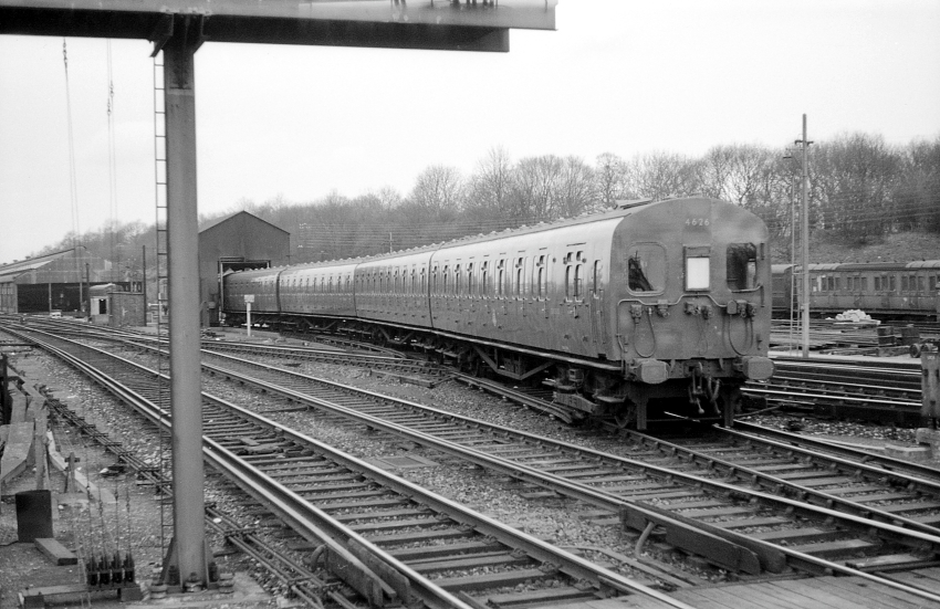 Bulleid-designed 4 SUB No. 4626, wearing all-over BR (S) Green, is seen entering platform 5. The unit had originated from the carriage cleaning shed - background left - and all train movements to and from the depot passed through a mechanical washer. The grounded coach bodies on the right were alongside the former steam shed, which by this time was used by the Permanent Way Department. The vertical cables on the left led to a series of semaphore signal arms. © David Glasspool Collection