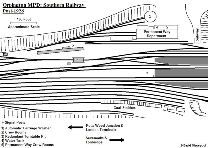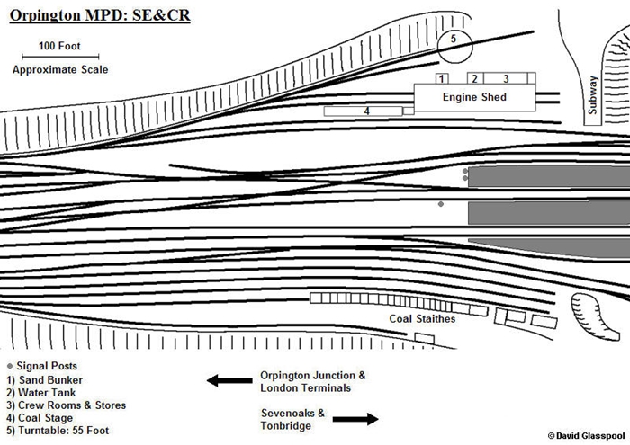 Orpington was transformed into a sizeable six-platform affair, and was of strategic importance, for it laid at the end of the four-track section of route, marking the boundary of the London commuting zone. To provide locomotive facilities at the ‘’country’’ end of the suburban operation, an engine shed was incorporated into the plans of the Orpington station rebuild. The building that eventually transpired reflected the architectural style employed in the station structures, and could easily be mistaken for a product of the LC&DR. To the north of the platforms, a double-track through affair, constituted of crème brick and demonstrating arched orange window frames, emerged. Measuring approximately 164-foot down by 37-foot across, the building had a direct connection with a set of ‘’down’’ side carriage sidings beyond its northern end. A second set of sidings, to the shed’s south, had a trailing connection with the depot complex. Along the structure’s eastern elevation were the customary locomotive crew rooms and a two-storey-high 20-foot wide square-based water tank. The layout here was equipped with a 55-foot turntable, positioned beside the shed’s eastern elevation; this generous size allowed its use by the majority of the SE&CR’s tender locomotive fleet, in addition to the resident tank engines. Finally, a coaling stage was in evidence beside the building's approach tracks (all descriptions thus far are later illustrated in diagram form). The shed was coded ‘’7’’ by the SE&CR, and joined Bricklayers Arms, Cannon Street, and Slade Green as a depot situated within the suburban operation on the ex-SER lines. Bricklayers Arms mainly dealt with those locomotives assigned to freight work, but the latter two had locomotive allocations geared for passenger work. Building of the engine shed at Slade Green had in fact begun under SER auspices, as part of that company’s drive to modernise its locomotive operation along the North Kent routes. Opening in 1899, the eight-road depot replaced sheds at Woolwich Arsenal and Deptford. Similarly, the commissioning of the shed at Orpington, combined with the installation of connecting loops between the ex-SER and ex-LC&DR lines in the vicinity of Chislehurst, allowed the closure of the single-track dead-end ‘’Chatham’’ depot at Bickley. This diminutive shed dated from 1858.