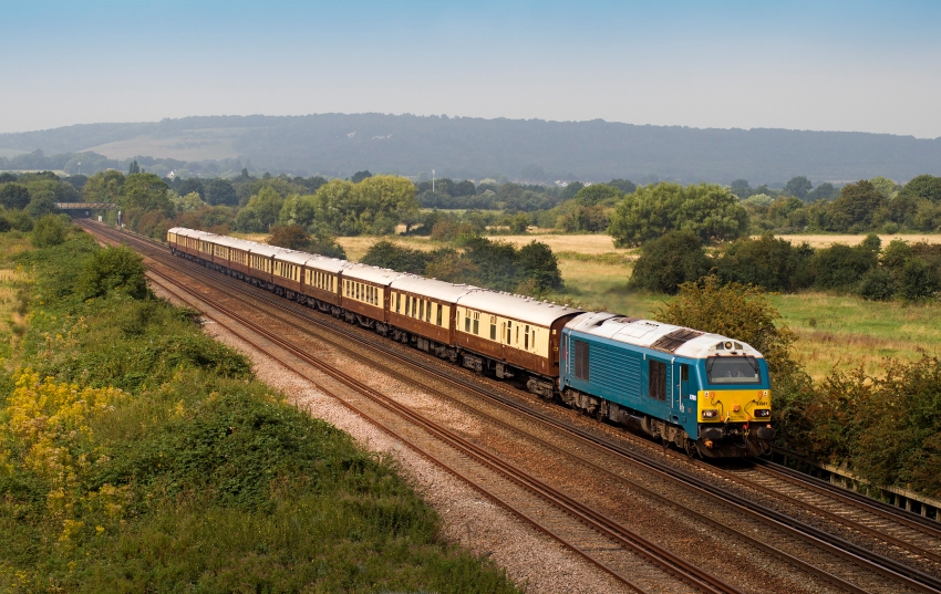 Class 67 No. 67001 is seen just after crossing over Otford Junction with the 11:07 London Victoria to Gillingham "British Pullman". No. 67001 had worn the all-over blue livery of "Arriva Trains Wales" since autumn 2011, although was still a "DB Cargo" (formerly EWS) locomotive. In December 2023, No. 67001 was advertised for sale by DB Cargo. In the foreground is the freight loop commissioned in March 1994, in connection with the Channel Tunnel. © Wayne Walsh