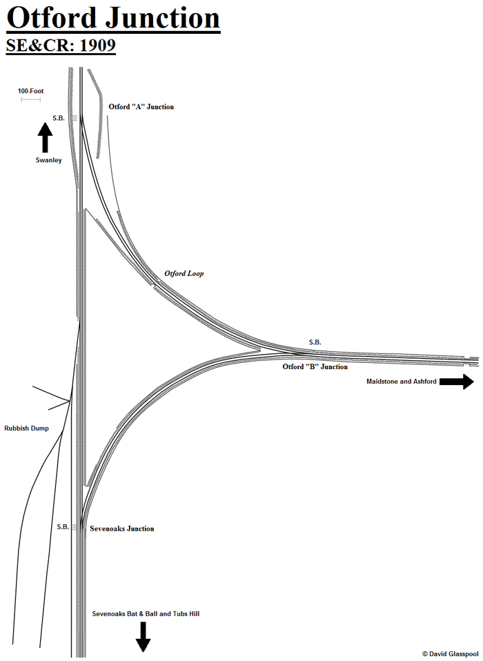 A 1940 overview shows the southern part of the triangle to have been lifted, resulting in abolition of Otford ''B'' and Sevenoaks Junctions. Sevenoaks Brickworks had been established in 1928, the rail connection seen in the above diagram having come into use at that time. The brick works' line continued south to a large sand pit and rail-served building. The works ceased to have a rail connection with British Railways in 1955, but operation here continued until 1991. Drawn by David Glasspool