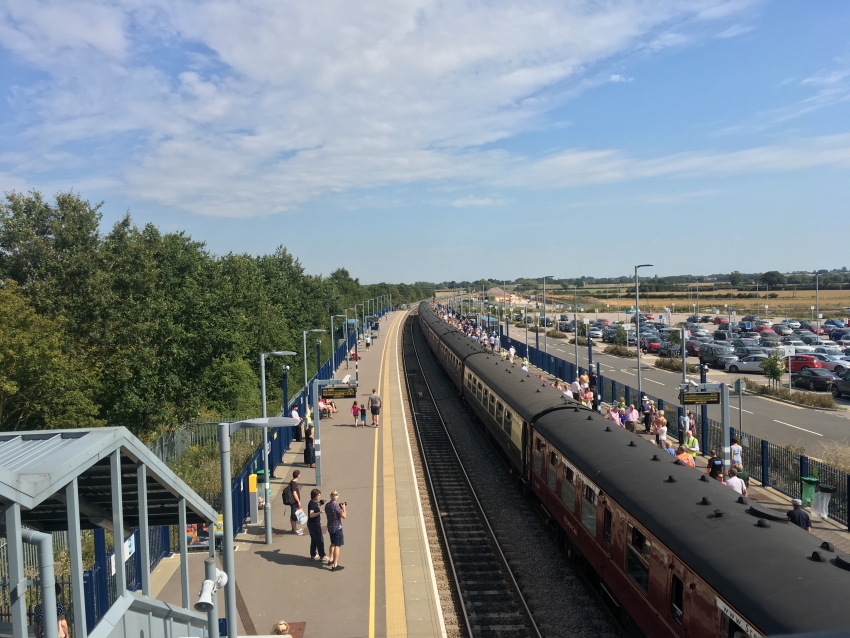 The car park on the right of this north eastward view towards Bicester has capacity for 830 vehicles. In the background can just be seen the relocated aggregate terminal. The carriage stock had arrived from Paddington behind record-breaking steam locomotive No. 60103 “Flying Scotsman” and was also Oxford-bound. © David Glasspool