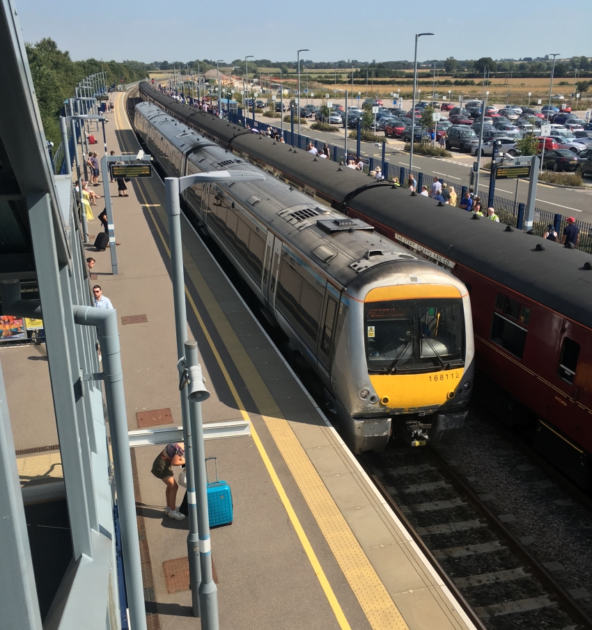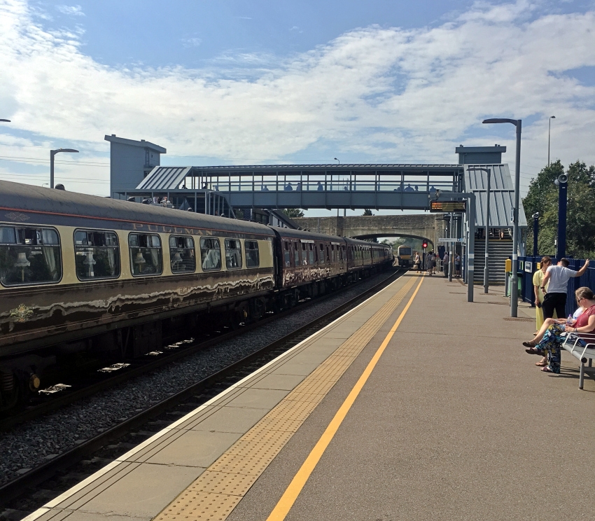 The lift-equipped footbridge has a partially-glazed main span. Each platform is equipped with a small waiting shelter. This south westward view shows Class 168 No. 168112 in the distance heading to its final destination: Oxford. © David Glasspool