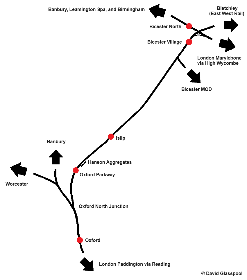 Works to build the chord between the routes began in summer 2013, which included using 80,000 tons of recycled ballast to form an embankment of about half a mile in length (ref: The Railway Magazine, November 2013). The last passenger service from Bicester Town prior to the closure of the route to Oxford North Junction for upgrading was scheduled to be the 21:31 to Oxford on Friday, 14th February 2014; that would be followed by a return working from Oxford at 23:12 (ref: Branch Line News No.1198, Branch Line Society, 7th December 2013). Closure of the line was effective the following day.