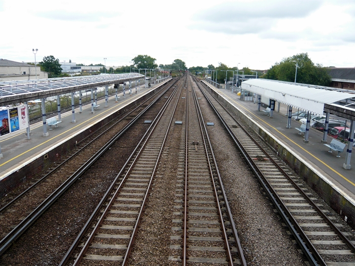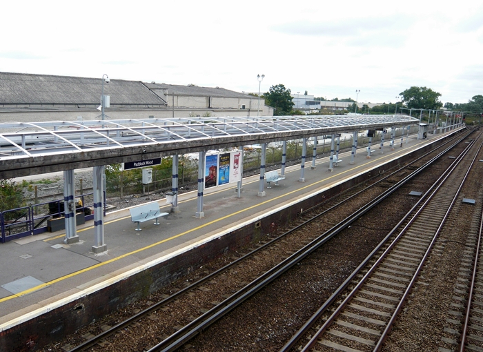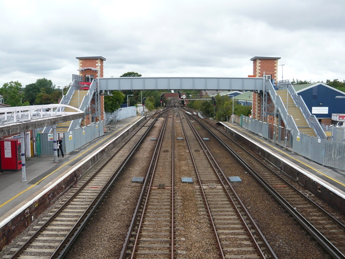 In April 2013, proposals were put forward by Network Rail to Paddock Wood Town Council for a new station footbridge. The results of those plans are seen nearing completion in the above view. The footbridge has been erected at the western ends of the platforms and the lift towers have been encased in red brick, frescoed with stone edges, to be more in keeping with the surviving bygone architecture. © Mike Glasspool