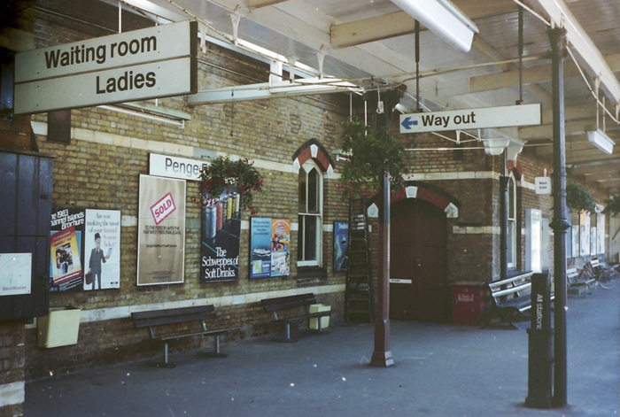 19th Century brickwork, 1970s British Rail signage, and early 1980s advertisements in evidence under the canopy on the "up" platform. The posters were promoting the 1983 Channel Islands holiday brochure, Schweppes soft drinks, and SeaLink. The latter was the ferry arm of British Rail, which was subsequently sold to Sea Containers for £66,000,000 in 1984. © Kevin McArdell